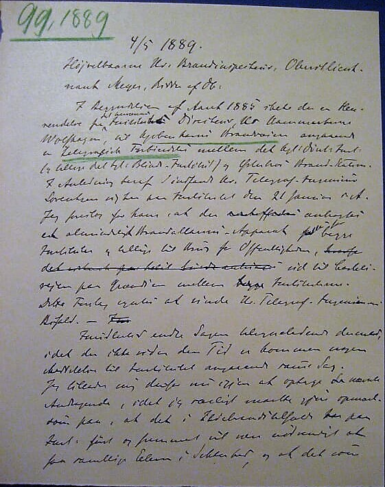 I Begyndelsen af Aaret 1885 skete der en Henvendelse fra det herværende Instituts Directeur, Hr. Kammerherre Wolfhagen, til Kjøbenhavns Brandvæsen[2] angaaende en telegrafisk Forbindelse mellem det kgl: Døvst: Inst: (tillige det kgl: Blinde-Institut) og Østerbros Brand-Station.[3] I anledning heraf indfandt Hr. Telegraf-Ingenieur Lorentzen[4] sig her paa Institutet den 21 Januar s. Aar. Jeg foreslog for ham, at der anbragtes et almindeligt Haandallarms-Apparat for begge Instituteter og tillige til Brug for Offentligheden ind til Castelsvejen paa Grændsen mellem Institutionerne. Dette Forslag syntes at vinde Hr. Telegraf-Ingenieurens Bifald. –