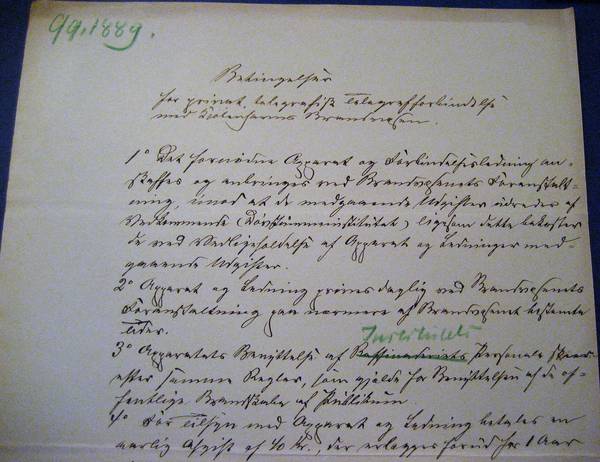 [3] JMC: Bilaget fandtes også i Rigsarkivet, sammen med Meyers brev; det indeholder ”Betingelser for privat telegrafisk Telegrafforbindelse med Kjøbenhavns Brandvæsen”. Bilaget følger i transkribering umiddelbart efter Meyers skrivelse.