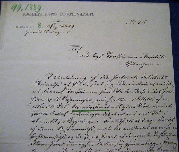 Den 4 maj 1889 skrev Rasmus Malling-Hansen til brandinspektøren i København, Deodatus Fredericus Sextus Meyer (1834-1921) for at minde om behovet for en særlig brandalarm for døvstumme- og blindeinstituttet i fællesskab; se dette brev, som også er tilføjet oplysninger om Københavns brandvæsen og om inspektør Meyer. Brevet er skrevet med en smuk og dekorativ håndskrift – men med anvendelse af en arkaisk håndskriftsstil, som er yderst besværlig at tyde. Hvis en læser finder fejl i mine tolkninger, eller kan komplettere dem, er jeg taknemmelig!