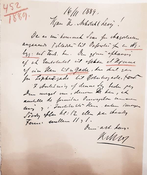Der er nu kommet Svar fra Magistraten angaaende Tilladelse til Opførelse af en Nybygn: ved Inst. her. Den gjøres afhængig af at Institutet vil spare et Hjørne af sin Have til en Gade, der skal gaa fra Lipkesgade til Østerbrogade.