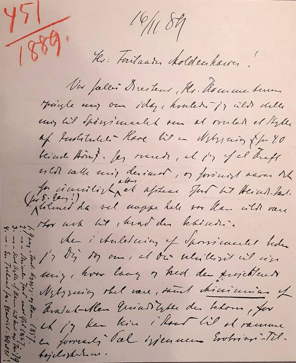 Man mærker tydeligt på brevets tone og formuleringerne, at Malling-Hansen er voldsomt irriteret over det, han betegner som Blindeinstituttets ’erobringstilbøjeligheder’ i relation til Døvstummeinstituttets grund. Den 22 november 1889 skrev Malling-Hansen til F. Wolfhagen i samme ærinde og udtalte sin tydelige modstand mod forslaget, at hans institut skulle afgive yderligere jord til naboen, Blindeinstituttet.