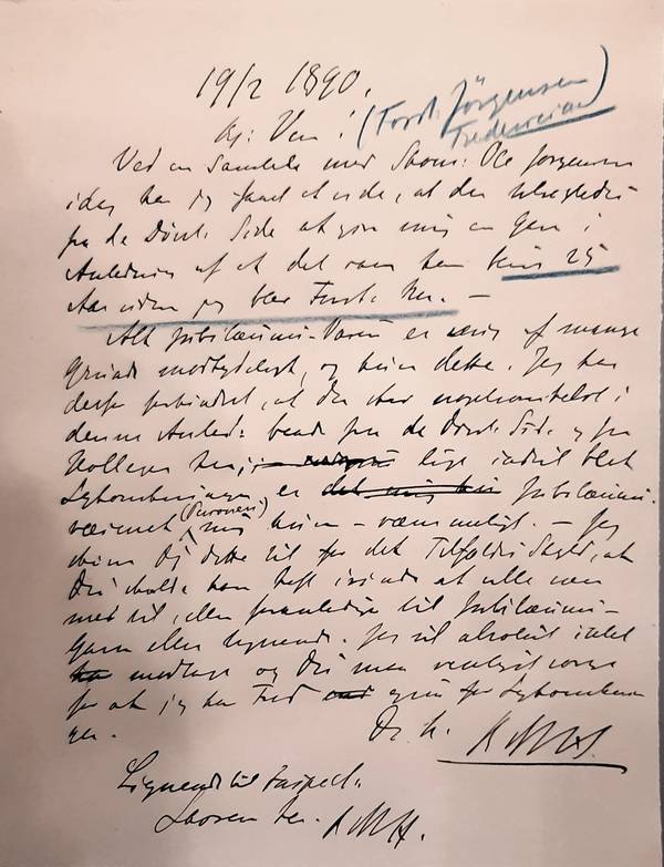 Alt Jubilæums-Væsen er mig af mange Grunde modbydeligt, og kun dette. Jeg har derfor forhindret, at der sker nogetsomhelst i denne Anledning baade fra de Døvst. Side og fra Kolleger her; lige indtil blot Lykønskninger er Jubilæumsvæsenet (Personens) mig kun væmmeligt. – Jeg skriver Dig dette til for det Tilfældes Skyld, at Du skulde have isinde at vill være med til, eller foranledige til Jubilæums-Gaver eller lignende. Jeg vil absolut inte modtage og Du maa venligst sørge for at jeg har Fred ... for Lykønskninger.