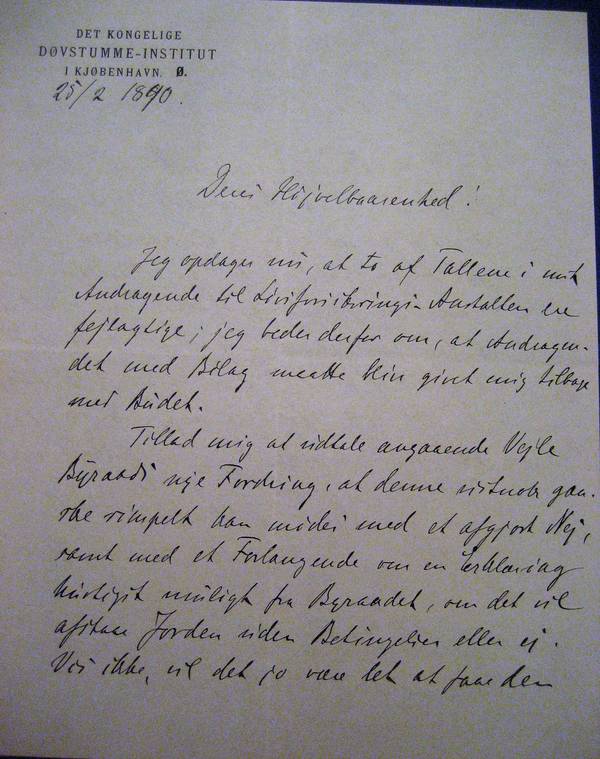 Dette håndskrevne brev indledes med en bemærkning om et dokument, som Malling-Hansen åbenbart skal sende til et livsforsikringsselskab, men fortsætter så med at besvare den forespørgsel som Wolfhagen havde fået dagen forinden fra Ministeriet og som omhandlede Vejle Byråds eventuelle krav i relation til at en byggegrund, som ministeriet ville kunne anvende til et ny døvstummeinstitut. Se dette brev i brevsamlingen!
