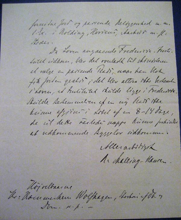 Tillad mig at udtale angaaende Vejle Byraads nye Fordring, at denne vistnok ganske simpelt kan mødes med et afgjort Nej, samt med et Forlangende om en Erklæring hurtigst muligt fra Byraadet, om det vil afstaae Jorden uden Betingelser eller ej. Vis[2] ikke, vil det jo være let at faa den fornødne Jord og passende Beliggenhed m.m. t. Ex. i Kolding, Horsens, Aarhus m.fl. Steder.