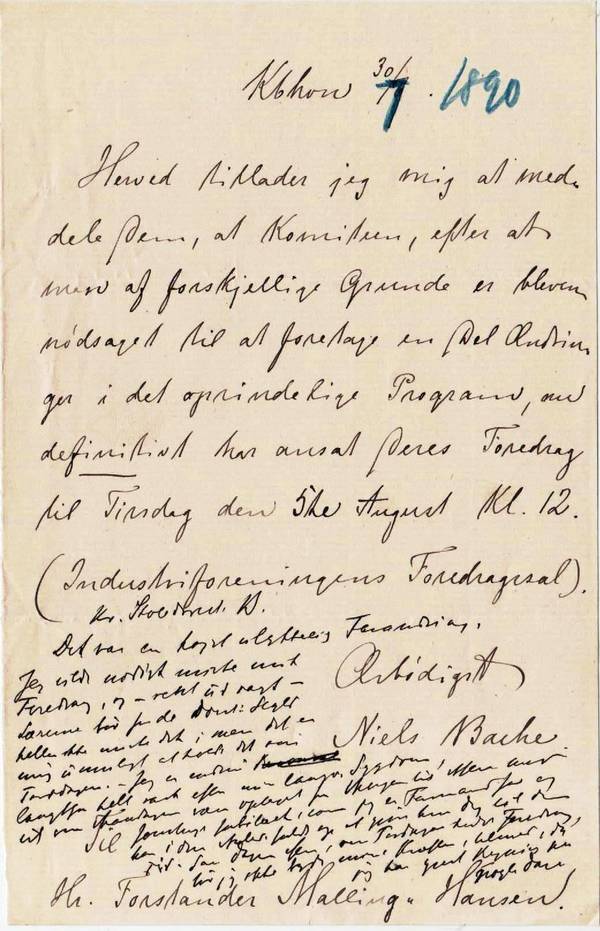 This letter comes in two parts: the first part is a message from Niels Bache, representing the preparatory committee for the great Nordic Educational Conference in Copenhagen in the autumn of 1890, to the effect that RMH’s lecture has been moved to Tuesday August 5[1]