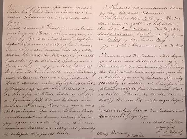 Hvad derimod min Dygtighed som Leder og Bestyrer af en saadan Anstalt angaar, da troer jeg at turde udtale, at jeg er ligesom ført til at beklæde en saadan Stilling, hvorom ogsaa mine Anbefalinger for min Lærer- og Bestyrervirksomhed noksom vidne, ligesom jeg ogsaa er overbevist om, at nedennævnte Herrer ere villige til personlig at anbefale mig paa det bedste.