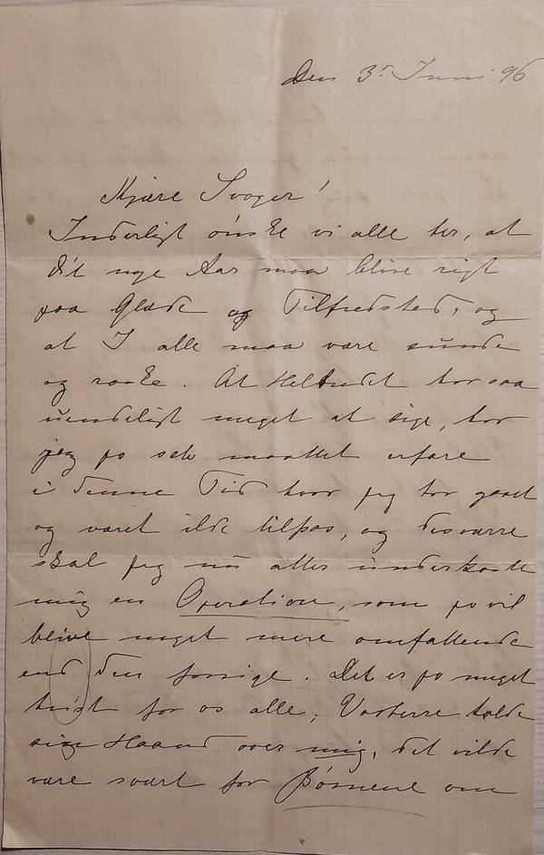 Inderligt ønske vi alle her, at det nye aar maa blive rigt paa Glæde og Tilfredshed, og at I alle maa være sunde og raske. At Helbredet har saa uendeligt meget at sige, har jeg jo selv maattet erfare i denne Tid hvor jeg har gaaet og været ilde tilpas, og desværre skal jeg nu atter underkaste mig en Operation, som jo vil blive meget mere omfattende end den forrige. Det er jo meget trist for os alle; Vorherre holde sin Haand over mig, det vilde være svært for Børnene om Hjemmet skal lukkes ligesom min gamle Moder jo vilde føle sig mere ensom paa sine gamle Dage.