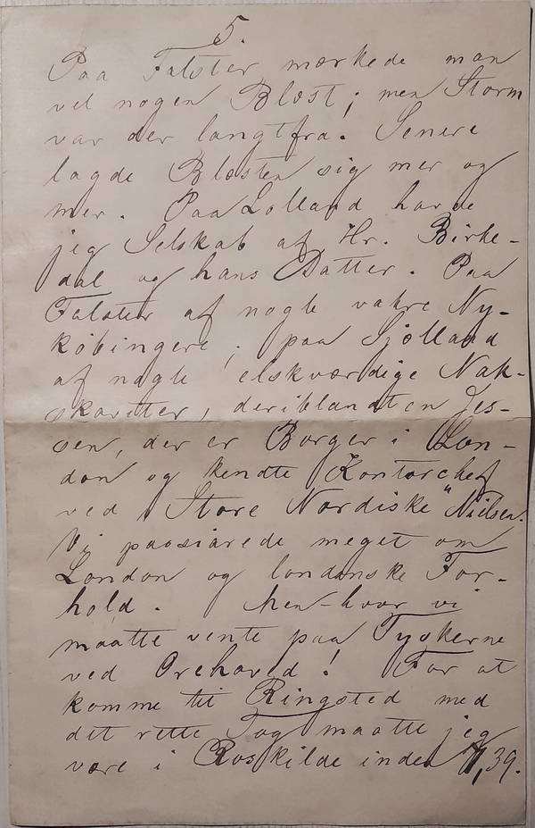 Rejsen var ikke ganske heldig, men dog i mange Stykker behagelig. Der var saa stor en ........ (JMC: ’Skylder’?), at jeg kun har set noget lignende i Roskilde i Pinsen, da der var stor Haandværkerfest i Nestved. Men jeg havde behageligt og venligt Rejseselskab. Paa Falster mærkede man vel nogen Blæst; men Storm var der langfra. Senere lagde Blæsten sig mer og mer. Paa Lolland havde jeg Selskab af Hr. Birkedal og hans Datter. Paa Falster af nogle vakre Nykøbingere; paa Sjælland af nogle elskværdige Nakskovitter, deriblandt Jessen, der er Borger i London og kendte Kontorchef ved ”Store Nordiske” Nielsen. Vi passiarede meget om London og londonske Forhold[2]. Men – hvor vi maatte vente paa Tyskerne ved Ørehoved[3]! For at komme til Ringsted med det rette Tog maatte jeg være i Roskilde inden 7,39.