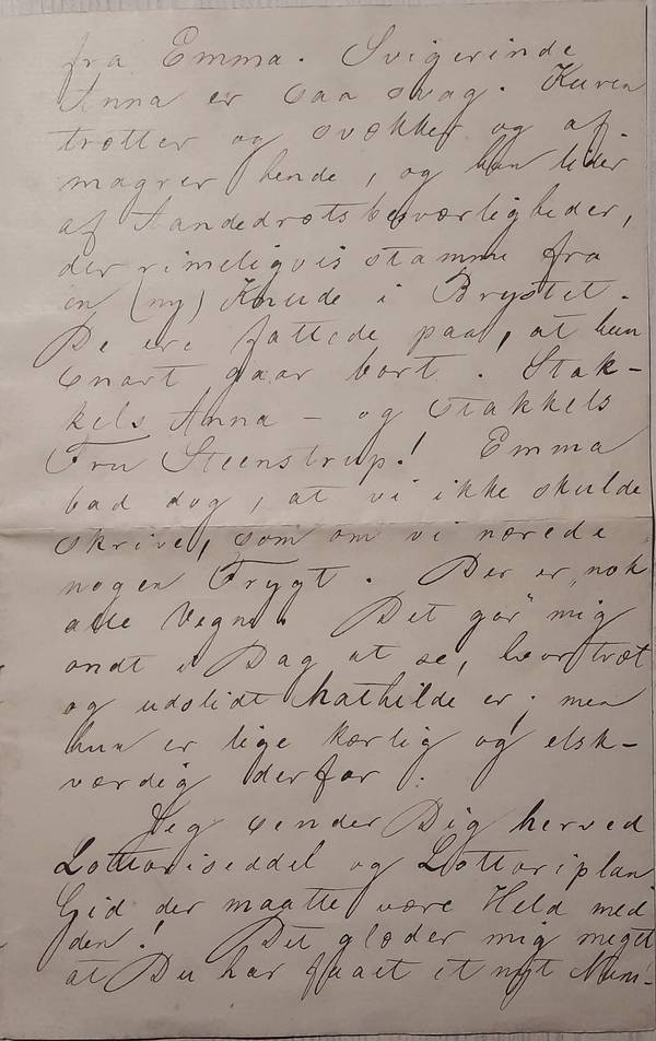 Jeg sender Dig herved Lotteriseddel og Lotteriplan. Gid der maatte være Held med den! Det glæder mig meget at Du har faaet et nyt Nummer, ikke fordi jeg eller Du trænger til et Bevis for, at jeg har gjort mig Umage i den Retning; - det ved jeg, der ikke behøves imellem os to - ; men kun fordi jed ved Du har ønsket en Forandring deri.