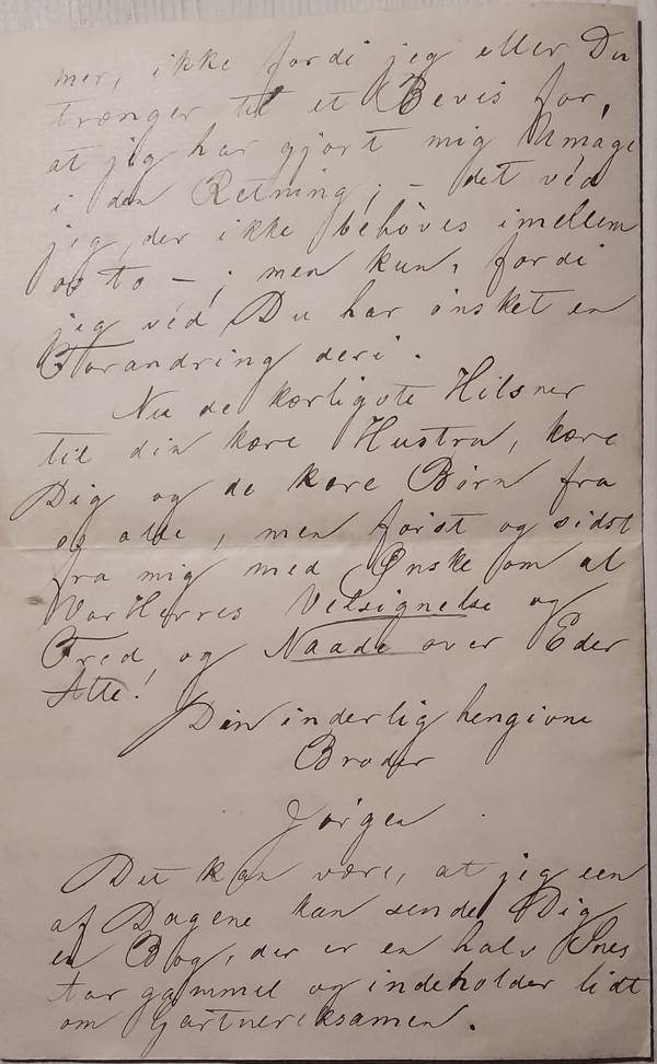 Nu de kærligste Hilsner til din kære Hustru, kære Dig og de kære Børn fra os alle, men først og sidst fra mig med Ønske om al vor Herres Velsignelse og Fred, og Naade over Eder Alle!