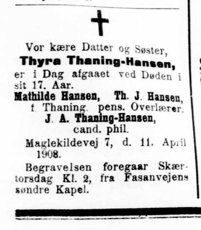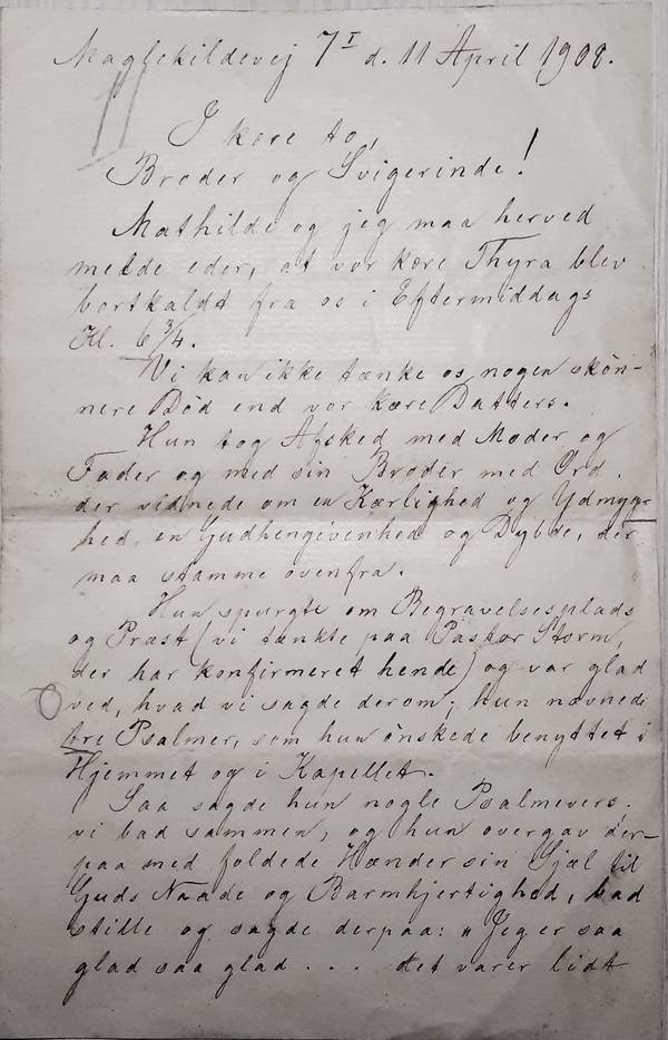 Mathilde og jeg maa herved melde eder, at vor kære Thyra blev bortkaldt fra os i Eftermiddags Kl. 6¾.