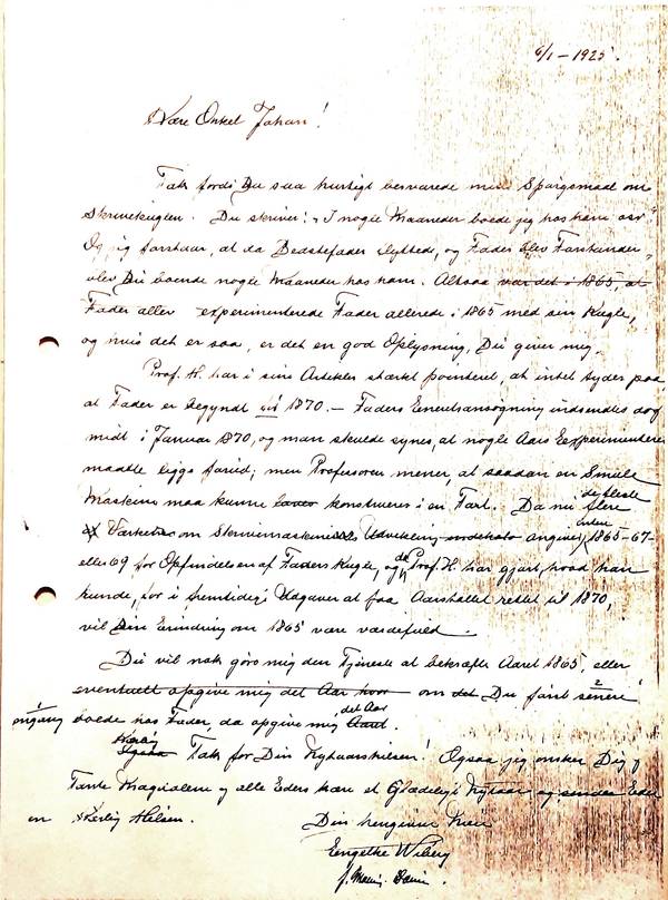 Prof.H. har i sine Artikler stærkt pointeret, at intet tyder paa, at Fader er begyndt før 1870. – Faders Eneretsansøgning indsendtes dog midt i Januar 1870, og man skulde synes, at nogle Aars experimenteren maatte ligge forud; men Professoren mener, at saadan en smule Maskine maa kunne konstrueres i en Fart. Da nu de fleste Værker om Skrivemaskinens Udvikling angiver enten 1865-67 eller 69 for Opfindelsen af Faders Kugle, og da Prof. H. har gjort, hvad han kunde, for i fremtidige Udgaver at faa Aarstallet rettet til 1870, vil Din Erindring om 1865 være værdifuld.