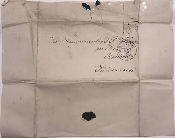 [1] JMC: Frimærket var klippet af. I december 2021 fandt jeg frimærket fra dette brev - i Vildriks (død 1979) gamle frimærkesamling. Det første danske frimærke blev udgivet i 1851, og dette mærke fra 1857 er altså et af de meget tidlige.