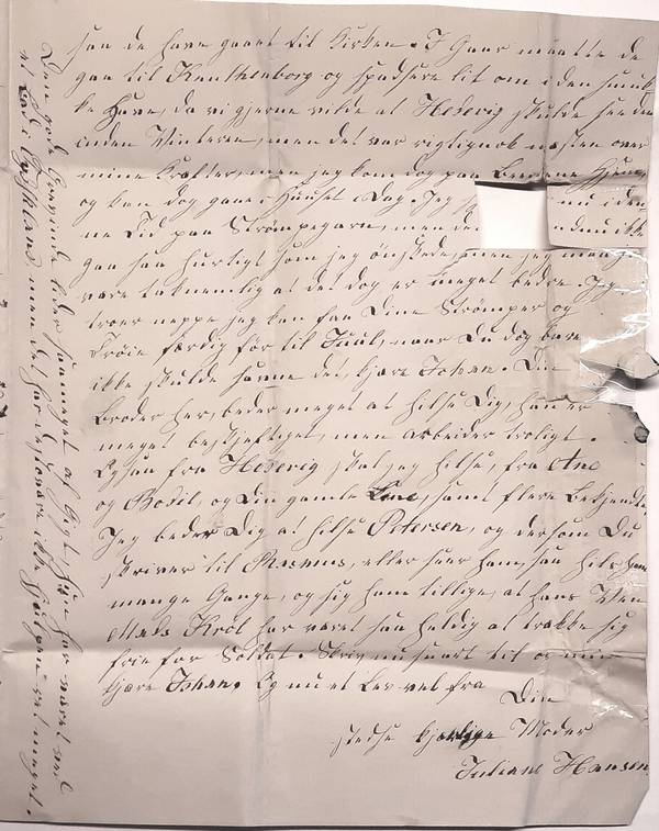 I Gaar maate de gaa til Knuthenborg............at Hedevig[4]....inden Winteren.....det var rigtignok næsten ....mine Kræfter, men jeg kom dog saa ....igjennem... og kan dog gaae i Dag. Jeg .....nu i denne Tid paa Strømpegarn.....ikke gaa saa hurtigt som jeg ønskede, men jeg maa jo være taknemmelig at det dog er saa meget bedre. Jeg tror næppe jeg kan have dine Strømper og Trøie færdig før til Juul, mon Du dog ...ikke skulde savne det, kjære Johan. Dine.....bad at meget hilse Dig...han er meget beskjæftiget, ....arbeider troligt. Ogsaa fra Hedevig skal jeg hilse, fra ... og Bodil[5] og din gamle ...samt flere Bekjendte. Jeg beder Dig at hilse Petersen, og ...Du skriver til Rasmus, ....saa hils ham mange Gange, og sig ham tillige, at .......Krøl...helidag at trække sig fri fra ..... Skriv nu snart til os kjære Johan. Og nu et .....fra