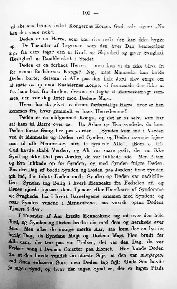 Døden er en ældgammel Konge, og det er os selv, som har sat ham til Herre over os. Da Adam og Eva syndede, da kom Døden første Gang her paa Jorden. ”Synden kom ind i Verden ved ét Menneske og Døden ved Synden, og Døden trængte igjennem til alle Mennesker, idet de syndede Alle”. (Rom.5,12). Gud havde skabt Verden, og Allt var saare godt; der var ikke Synd og ikke Død paa Jorden, de var lukkede ude. Men Adam og Eva lukkede åp for Synden, og med Synden fulgte Døden. Fra den Dag af boede Synden og Døden paa Jorden; hovr Synden gik ind, dér fulgte Døden med; Synden og Døden var uadskillelige. Synden tog Bolig i hvert Menneske fra Fødselen af, og Døden gjorde ligesaa; dens Tjenere eller Hærskarer af Sygdomme og Svagheder laa i hvert Barnelegeme sammen med Synden; og naar synden voxede i Menneskene, saa voxede ogsaa Dødens Tjenere i dem.