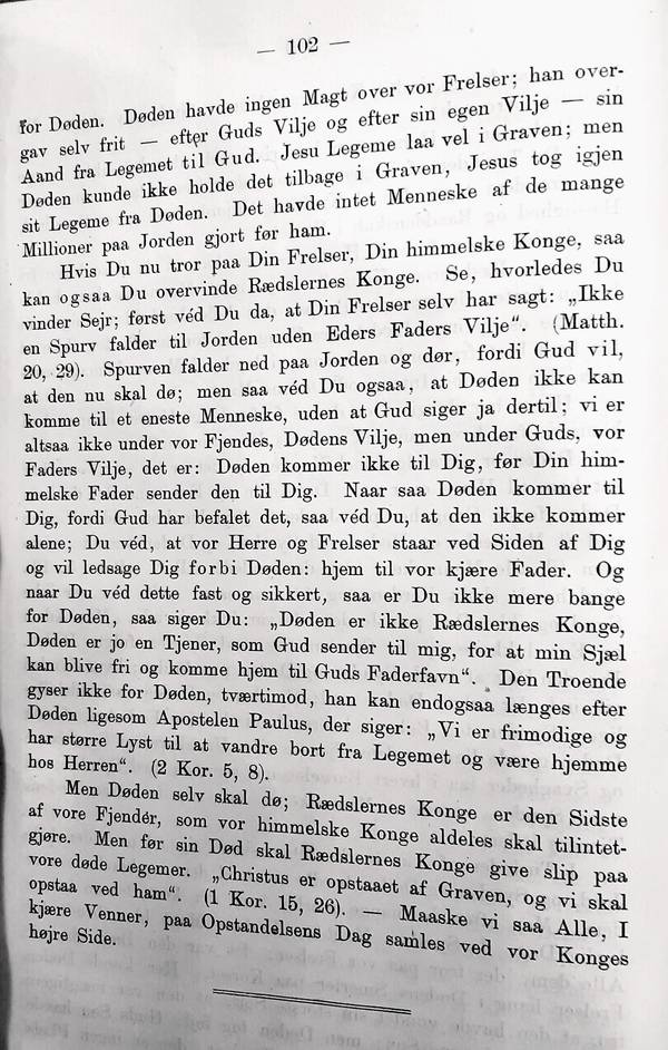 Men Døden selv skal dø; Rædslernes Konge er den sidste af vore Fjender, som vor himmelske Konge aldeles skal tilintetgjøre. Men før sin Død skal Rædslernes Konge give slip paa vore døde Legemer. ”Christus er opstaaet af Graven, og vi skal opstaa ved ham”. (1 Kor. 15,26). – Maaske vi saa alle, I kjære Venner, paa Opstandelsens Dag samles ved vor Konges højre Side.