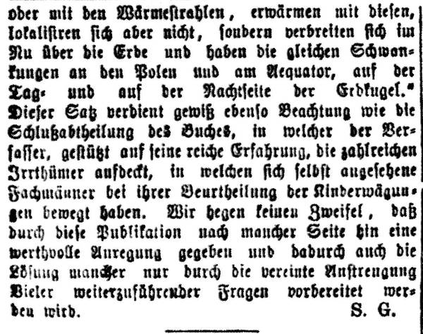 Weiterhin zieht dann unsere Schrift auch noch andere Faktoren der Erdphysik, den Dampfdruck und Ozongehalt der Luft, den Erdmagnetismus u.s.w. in‘s Bereich der Betrachtung und sucht auch in den Schwankungen dieser Elemente analoge Regelmäßigkeiten zu entdecken, wie ihm Das hinsichtlich der zuerst untersuchten gelungen ist. Dieser Theil der großen Arbeit scheint uns, obwohl wir bereitwillig die an ihn gesetzte Hingebung anerkennen, noch nicht in gleicher Weise reife Früchte zu bringen wie der frühere, denn es handelt sich hier um so verwickelte Verhältnisse, daß eine Aufklärung darüber erst von einer nicht sehr nahen Zukunft zu erwarten sein möchte. Wir enthalten uns deshalb auch weitern Eingehens in die Reflexionen des Verfassers über Sonnenphysik, weil uns dieselben zu dem eigentlichen Gegenstande vorläufig noch in einer zu wenig engen Beziehung zu stehen scheinen. Den Schlußsatz aber glauben wir, weil derselbe ein vom Detail der Untersuchung unabhängiges Interesses besitzt, wörtlich wiedergeben zu sollen: „Alle organische Funktionen über den ganzen Erdball hin befinden sich in ununterbrochenen und übereinstimmenden Intensitätsschwankungen. Die Impulse zu diesen gemeinsamen Schwankungen gehen von der Sonne aus, gelangen zur Erde im oder mit den Wärmestrahlen, erwärmen mit diesen, lokalisiren sich aber nicht, sondern verbreiten sich im Nu über die Erde und haben die gleichen Schwankungen and den Polen und am Aequator, auf der Tag- und auf der Nachtseite der Erdkugel.“ Dieser Satz verdient gewiß ebenso Beachtung wie die Schlußabtheilung des Buches, in welcher der Verfasser, gestützt auf seine reiche Erfahrung, die zahlreichen Irrthümer aufdeckt, in welchen sich selbst angesehene Fachmänner bei ihrer Beurtheilung der Kinderwägungen bewegt haben. Wir hegen keinen Zweifel, daß durch diese Publikation nach mancher Seite hin eine werthvolle Anregung gegeben und dadurch auch die Lösung mancher nur durch die vereinte Anstrengung vieler weiterzufährender Fragen vorbereitet werden wird.