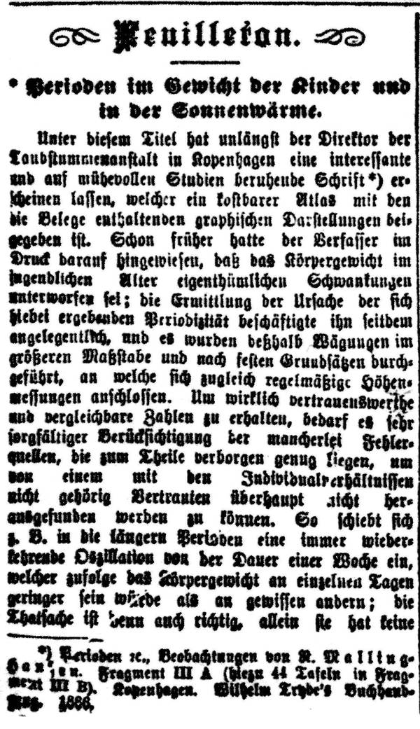 Unter diesem Titel hat unlängst der Direktor der Taubstummenanstalt in Kopenhagen eine interessante und auf mühevollen Studien beruhende Schrift[3] erscheinen lassen, welcher ein kostbarer Atlas mit den die Belege enthaltenden graphischen Darstellungen beigegeben ist. Schon früher hatte der Verfasser im Druck darauf hingewiesen, daß das Körpergewicht im jugendlichen Alter eigenthümlichen Schwankungen unterworfen sei; die Ermittlung der Ursache der sich hiebei ergebenden Periodizität beschäftigte ihn seitdem angelegentlich, und es wurden deshalb Wägungen im größeren Maßstabe und nach festen Grundsätzen durgeführt, an welche sich zugleich regelmäßige Höhenmessungen anschlossen. Um wirklich vertrauenswerthe und vergleichbare Zahlen zu erhalten, bedarf es sehr sorgfältiger Berücksichtigung der mancherlei Fehlerquellen, die zum Theile verborgen genug liegen, um von einem mit den Individualverhältnissen nicht gehörig Vertrauten überhaupt sich herausgefunden werden zu können. So schiebt sich z. B. in die längern Perioden eine immer wiederkehrende Oszillation von der Dauer eine Woche ein, welcher zufolge das Körpergewicht an einzelnen Tagen geringer sein würde als an gewissen andern; die Thatsache ist denn auch richtig, allein sie hat keine physikalischen, sondern einzig und allein einen physiologischen Untergrund, insofern nämlich der Speisezettel des Institutes für jeden Tag ein fester ist; der Appetit der Zöglinge und damit auch die Nahrungsaufnahme ist aber nicht allen Gerichten gegenüber die gleiche, und Zu- und Abneigung tritt dann auch in den Wägungen deutlich zu Tage. Wenn sich die Untersuchung jedoch über lange Zeiträume erstreckt, so wird die aus solch gleichbleibenden Fehlern erwachsende Störung immer einflußloser , das „Gesetz der großen Zahlen“ tritt in seine Rechte, und zumal bei der überall hervorleuchtenden Sorgfalt des Autors in der Zusammenstellung seiner Resultate dürften diese letztern unser volles Vertrauen verdienen.