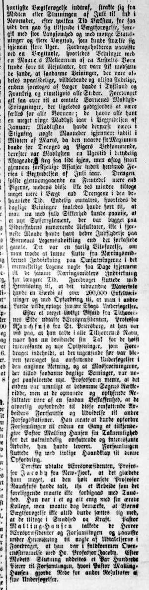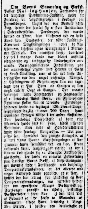 SA: Denne artikkelen har vi tidligere publisert i forbindelse med en presentasjon av flere av Rasmus Malling-Hansens offentlige foredrag, fra de nordiske abnormeskolemøtene i 1872 og 1876, den internasjonale legekongressen i 1884 og det store nordiske skolemøtet i 1890. I denne presentasjonen kan man se flere eksempler på den offentlige omtalen av legekongressen i 1884. Man kan også lese flere brev fra RMH til arrangørene og journalister angående hans foredrag. I et av brevene fremkommer det at det var lederen av den pediatriske seksjonen, barnelegen og professoren Harald Hirschsprung som oppfordret Malling-Hansen til å holde foredraget. RMH ville meget gjerne holde sitt foredrag for en større forsamling ved et av de såkalte "alminnelige møtene", men som et kompromiss fikk han holde det for en forsamling som besto av den sammenslåtte pediatriske og hygieniske seksjonen, og foredraget varte i henved en time. Etter foredraget delte Malling-Hansen ut opp mot 200 eksemplarer av hans skrift, Fragment II, Tägliche Wägungen.