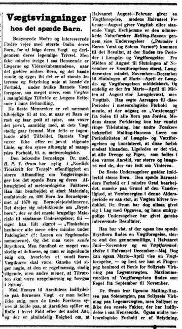 Den bekendte Børnelæge Dr. med. H. P. T. Ørum har nylig i ”Nordisk Tidsskrift for Terapi” offentliggjort en større Afhandling om Vægtsvingninger hos det spæde Barn og deres Afhængighed af meteorologiske Faktorer. Han har bearbejdet et stort Materiale, omfattede ca. 600 Børn fra Børnehjemmet af 1870 og Børneplejestationerne. Det drejer sig udelukkende om ”Brystbørn”, der er det eneste brugelige Materiale til saadanne Undersøgelser; thi – siger han lidt skarpt – ”Flaskebørn henhører alle mere eller mindre under Patologien” (?: Læren om Sygdomsfænomener). Og det maa være sunde Brystbørn. Men Sundhed er meget vanskelig at definere, og man er ingenlunde enig om, hvorledes et sundt Barns Vægtkurve skal være. Ganske vist siger nogle, at den er regelmæssig, stadig stigende, men andre mener, at Tilvæxten skal være uregelmæssig og foregaa i Spring.