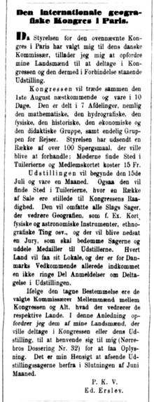 The Ministry appointed Erslev organizer of the Danish delegation and participation in the International Geography Congress in 1875 – the second such congress ever held. In the Danish Daily “Fædrelandet”, issue of May 24, 1875, Erslev publicly invited interested parties to submit geographical works and items to him in preparation for the congress.
