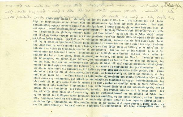 [4] CB: Dette tyder jo på, at også broderen havde en skrivekugle - i hvert fald midlertidigt - og kunne bruge den. Desværre har vi ikke bevaret ét eneste af broderens utallige returbreve til RMH. Formodentligt er de blandt de utallige dokumenter, som noen af RMHs døtre brændte i 1911. Så vi ved ikke (endnu) om brevene fra Jørgen til RMH var håndskrevne eller kugleskrevne.