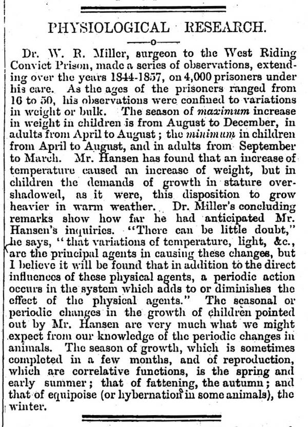 Dr. W.R.Miller, surgeon to the West Riding Convict Prison, made a series of observations, extending over the years 1844-1857, on 4,000 prisoners under his care. As the ages of the prisoners ranged from 16 to 50, his observations were confined to variations in weight or bulk. The season of maximum increase in weight in children is from August to December, in adults from April to August; the minimum in children from April to August, and in adults from September to March. Mr. Hansen has found that an increase of temperature caused an increase of weight, but in children the demands of growth in stature overshadowed, as it were, this disposition to grow heavier in warm weather. Dr. Miller’s concluding remarks show how far he had anticipated Mr. Hansen’s inquiries. “There can be little doubt”, he says, “that variations of temperature, light, &c[3], are the principal agents in causing these changes, but I believe it will be found that in addition to the direct influences of these physical agents, a periodic action occurs in the system which adds to or diminishes the effects of the physical agents.” The seasonal or periodic changes in the growth of children pointed out by Mr. Hansen are very much what we might expect from our knowledge of the periodic changes in animals[4]. The season of growth, which is sometimes completed in a few months, and of reproduction, which are correlative functions, is the spring and early summer; that of fattening, the autumn; and that of equipoise (or hibernation in some animals), the winter.