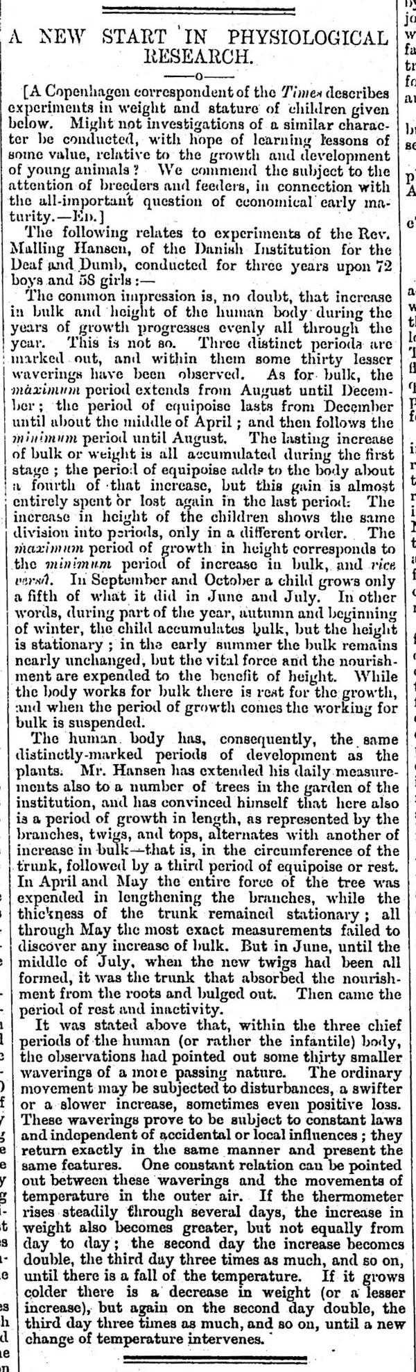 (A Copenhagen correspondent of the Times describes experiments in weight and stature of children given below. Might not investigations of a similar character be conducted, with hope of learning lessons of some value, relative to the growth and development of young animals? We commend the subject to the attention of breeders and feeders, in connection with the all-important question of economical early maturity. – Ed[2].)