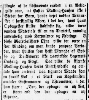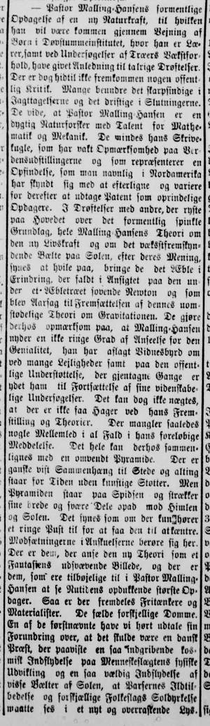 SA: Uansett kvalitet på artikkelen, synes jeg den er meget interessant for å forstå hvordan Malling-Hansens naturvitenskapelige forskning ble mottatt i hans hjemland av hans samtidige. Såvidt meg bekjent, er dette den hittil eneste artikkelen vi kjenner til som er kritisk til RMHs teorier, og selv om den er formulert i temmelig ironiske vendinger, er den muligens representativ for en del dansker. RMH fikk jo langt større anerkjennelse i utlandet enn i sitt hjemland, og det kan man muligens tilskrive et utslag av dansk misunnelse eller Jante-lov, som vi gjerne kaller det i Norge. Uansett bør vi sannsynligvis ikke se bort fra, at det faktisk fantes grunner til å kritisere RMHs teorier, men slik kritikk kommer ikke i akkurat denne kommentaren.
