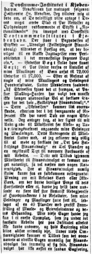 Vor videre forskning skal gå ud på at søge Malling-Hansens ansøgning om statsstøtte, og det fremgår af teksten, at hans ’andragende’ blev rettet til Kultusministeriet. Måske har Kultusministeriets embedsmænd tilføjet nogle kommentarer – eller en anbefaling – hvorefter ansøgningen er blevet sendt videre til Finansministeriet og Folketingets finansudvalg for deres bedømning. I øvrigt henviser vi også til Malling-Hansens brev af 11 marts 1883 til journalisten – og hans gode ven – Jonas Collin. Alting tyder på, at han til dette brev vedhæftede nedenstående indlæg.