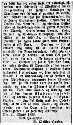 JMC: Vi har ikke fundet artiklen i Nationaltidende, som Malling-Hansens brev refererer til (og som må findes i en tidligere udgave af avisen fra samme dag), men derimod har vi den fuldstændige artikel – sandsynligvis komplet – som den publiceredes i Dags-Telegraphen den 11 marts 1883. Nedenstående brev til Jonas Collin bør altså læses sammen med Dags-Telegraphens artikel.