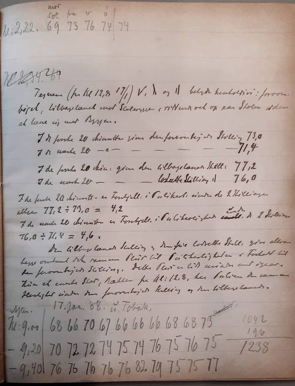 (JMC: her noterer RMH sine pulstællinger den ”17.Jan.1888.(tobak)”, og for hver pulstælling noterer han sin kropsstilling)