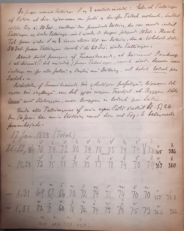 Da der hidtil under de Halv-Minut Pulstællinger er bleven talt paa højre, snart paa v. Side af Secund-Skiven, samt paa Punkter i h. el.v. Side, er der Grund til at antage at Uhrfejlen ikke kan have afgjort ødelæggende Betydning.