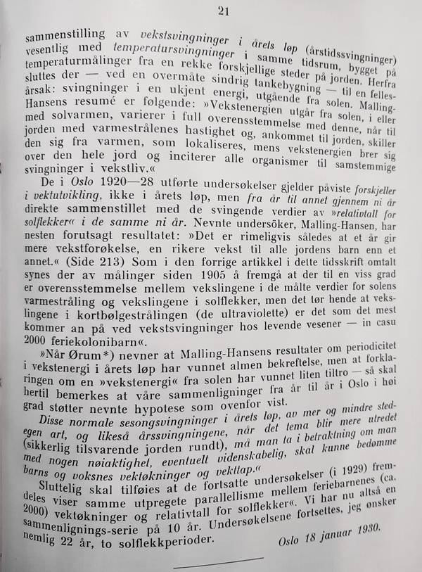 ”Når Ørum[2] nevner at Malling-Hansens resultater om periodicitet i vekstenergi i årets løp har vunnet almen bekreftelse, men at forklaringen om en ”vekstenergi” fra solen har vunnet liten tiltro – så skal hertil bemerkes at våre sammenligninger fra år til år i Oslo i høi grad støtter nevnte hypotese som ovenfor vist.
