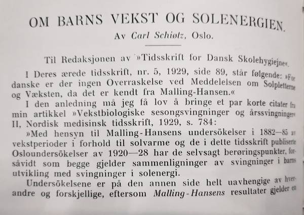 ”Med hensyn til Malling-Hansens undersökelser i 1882-85 av vekstperioder i forhold til solvarme og de i dette tidsskrift publiserte Osloundersökelser av 1920-28 har de selvsagt berøringspunkter, forsåvidt som begge gjelder sammenligninger av svingninger i barns utvikling med svingninger i solenergi.
