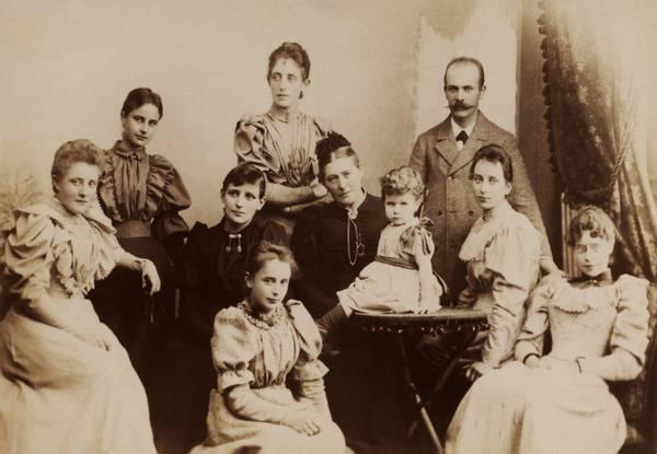 - Familien Malling-Hansen fotografert ca 1895. RMHs enke Anna Steenstrup sammen med alle døtrene, svigersønnen Fritz August Bech, og barnebarnet Zarah Bech. Fra venstre: Juliane, Johanne, Zarah, Marie(foran), Engelke, Anna, Zarah, Fritz, Karen og Emma. Foto: Det Kongelige Bibliotek