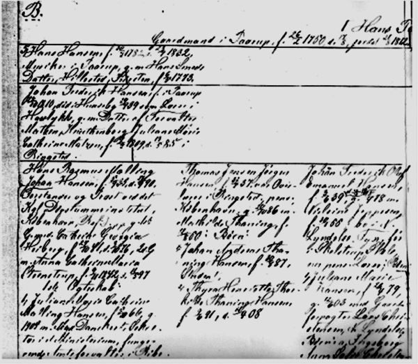 4. v Hans Hansen, født 30.08.1782, død 23.07.1832, stilling: Indsidder og musikant i Pårup. Han blev gift med Kirsten Hansdatter Smed.