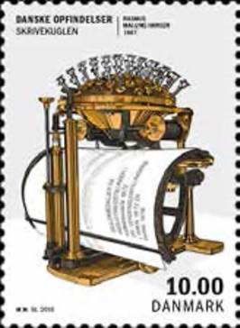 Among the 20 planned new stamps for 2015, there is a set of 4 stamps, presenting important Danish inventions. And one of these stamps is with the Writing Ball in its most beautiful version: The 1878 model with the colour ribbon. The particular writing ball on the stamp is one of the specimens from the colletion at Danish Technical Museum in Helsingør.