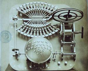 Det er en yderst kompliceret og genial konstruktion, hvor bogstaverne ikke rammer papiret i den rækkefølge de trykkes ned, men først, når det ”rigtige” sted på papirstrimlen passerer forbi.